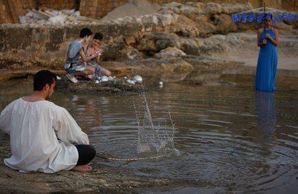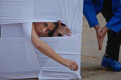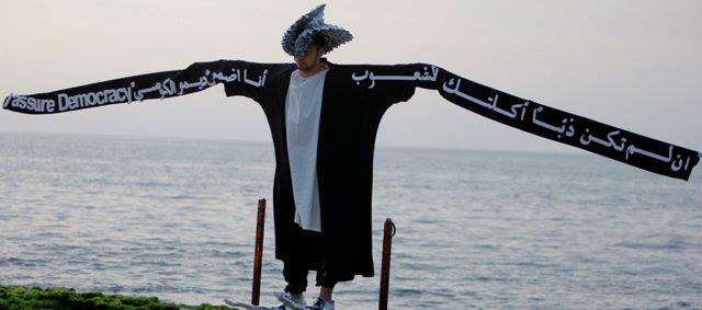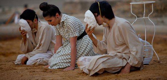 An eclectic combination of scenic installations, and a mosaic of cross-referenced plots and mythic characters summoned from ancient history into contemporary Lebanon. As this highly costumed performance progressed from one “island” to another, dispersed along both sides of a white line on which the audience walked, a mimed drama of conflicting signs of departure and fidelity gradually unfolded.